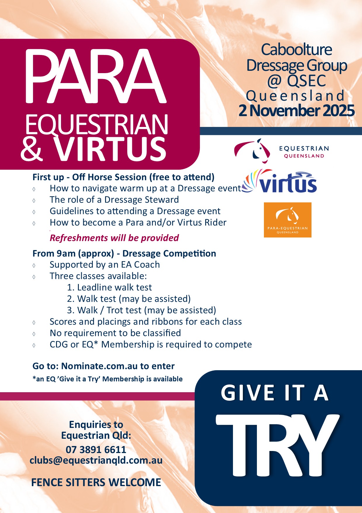 Add to your Calendar 02-11-2025 00:00:00 02-11-2025 00:00:00 Australia/Sydney EQ Para & Virtus 'Give It A Try' Dressage Day with CDG EQ Para & Virtus 'Give It A Try' Dressage Day with CDG Location QSEC [email protected] Equestrian Queensland