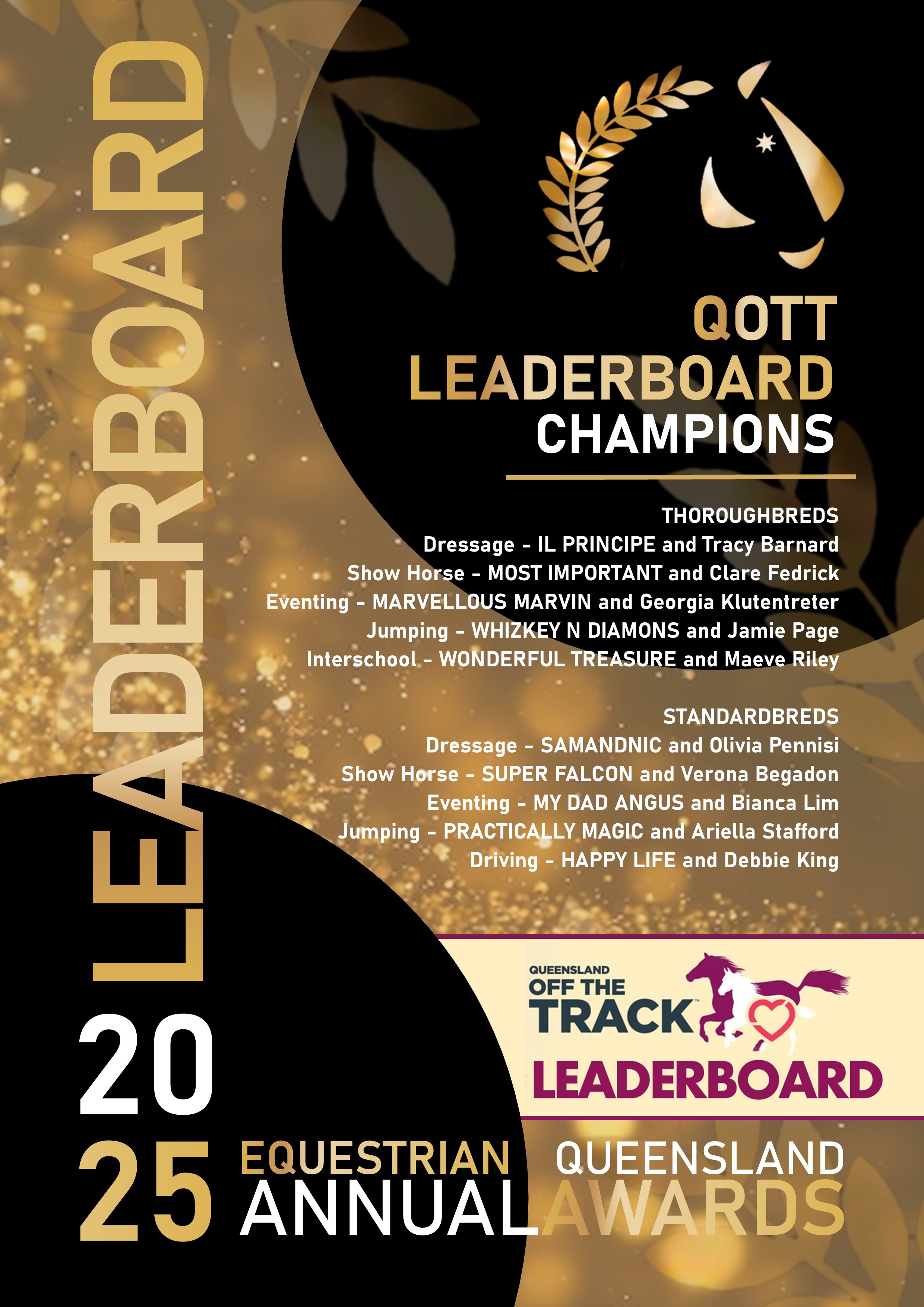 QOTT LEADERBOARDS HIGHEST PLACED OFF-THE-TRACK THOROUGHBRED & STANDARDBRED AWARDS Proudly sponsored Queensland Off-The-Track (QOTT). Award Criteria Period: November 2024 – October 2025 The QOTT Leaderboard established in 2022, highlights Standardbred and Thoroughbred ex racehorses excelling in their new careers. This award is NOT self-nominating. The QOTT Leaderboard High Point Horse Awards are presented to the OTT horses that have accumulated the highest points in each discipline. |