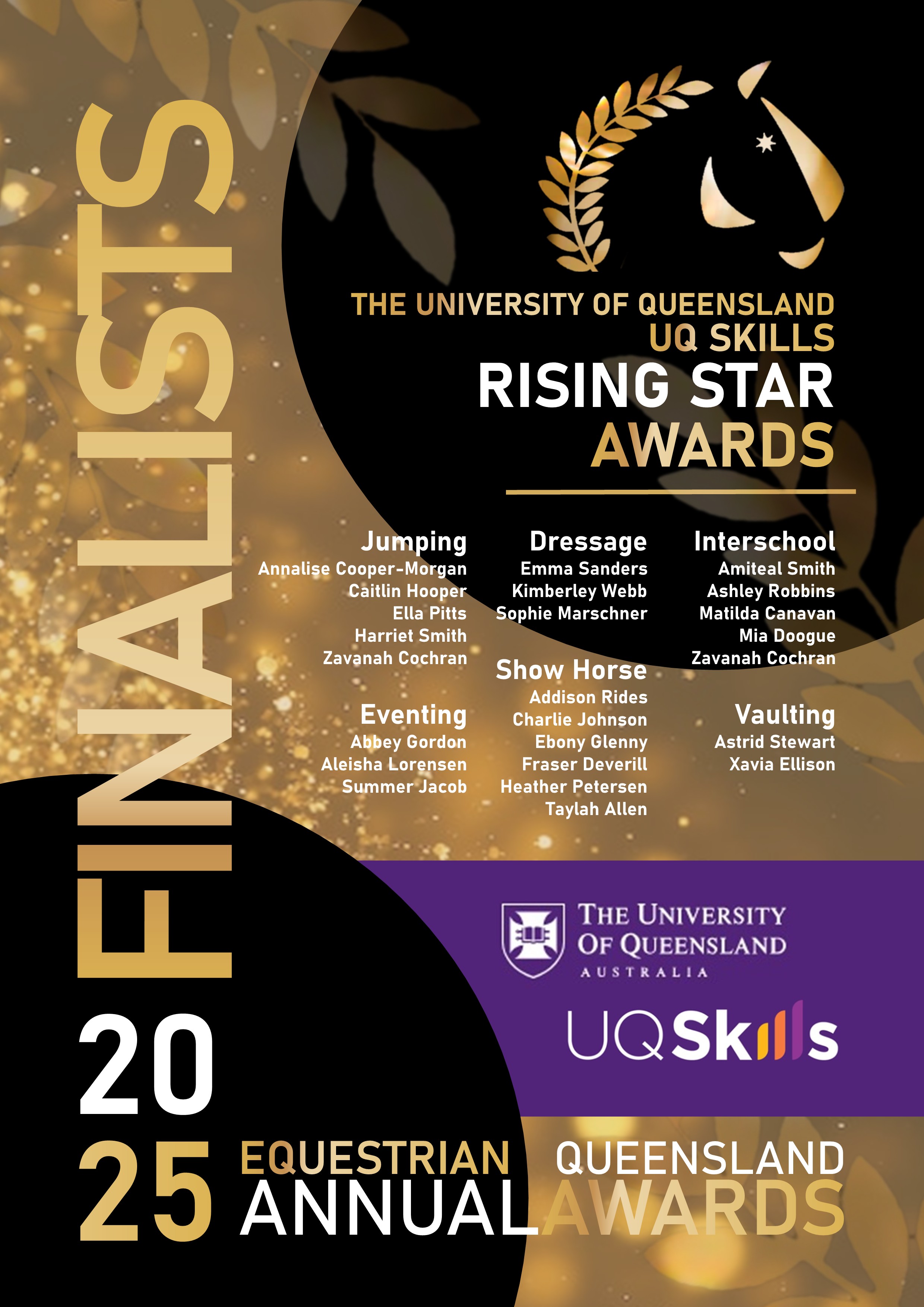 RISING STARS Proudly sponsored by The University of Queensland UQ Skills. This award is NOT self-nominating. Award Criteria Period: November 2024 – October 2025 This award recognises an athlete up to the age of 21 years of age as at 31 December 2025. Each of the Equestrian Queensland Sport Committees will nominate athletes that have met the following criteria in the past 12 months. In addition to the athlete demonstrating positive qualities and the EQ Values of Safety, Welfare of the Horse, Fairness, Accountability, Integrity and Respect in both practice and competition, the following performance criteria must be met:-