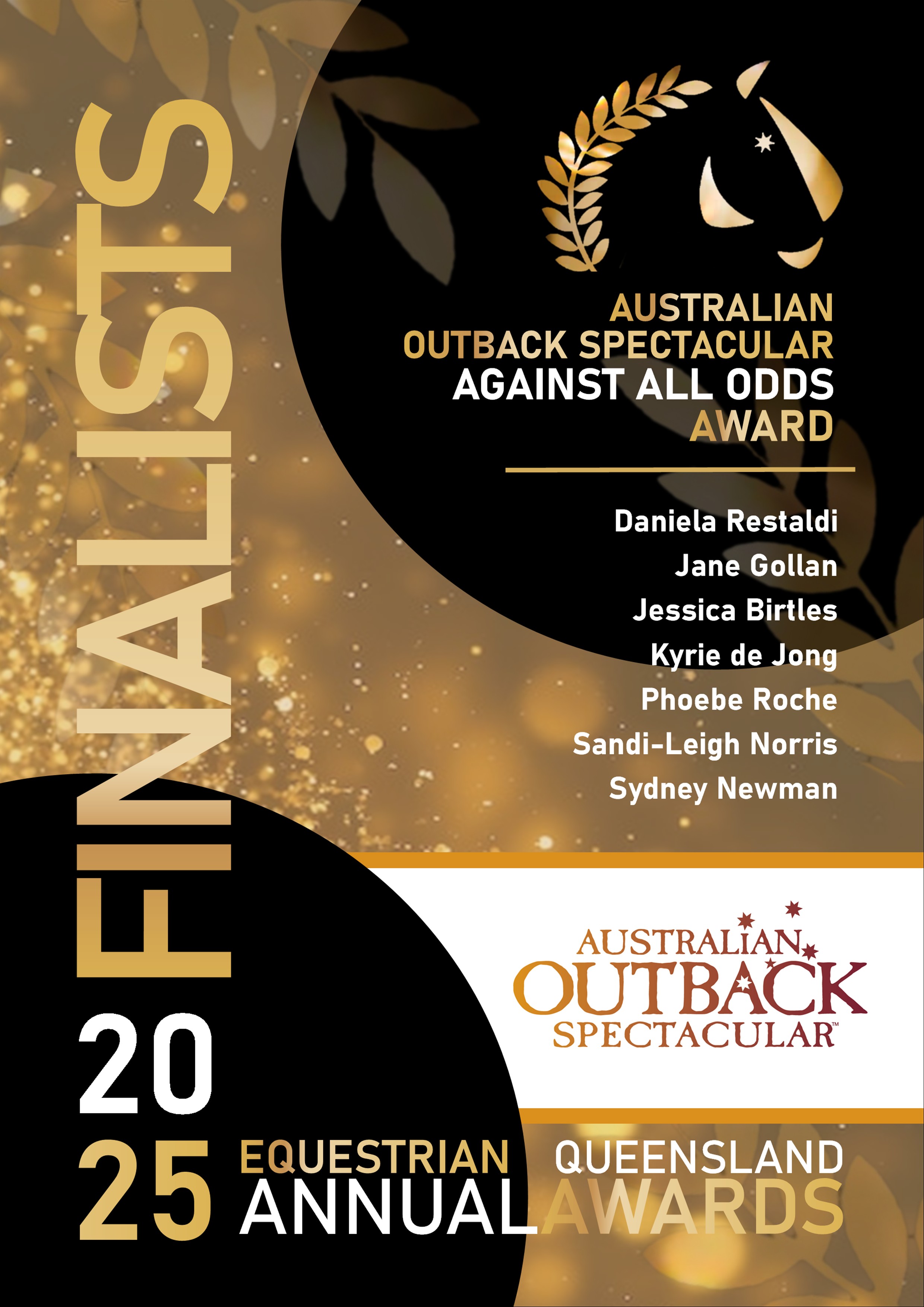 AGAINST ALL ODDS Proudly sponsored by Australian Outback Spectacular. Award Criteria Period: November 2024 – October 2025 This award recognises an individual who has pursued their equestrian ambitions despite extremely difficult personal circumstances. The category is open to all athletes regardless of age, who have overcome significant adversity through courage, human spirit, perseverance and resilience to consistently achieve at a high level either at local, State, National or International level in the past 12 months. The following criteria will be considered for judging: