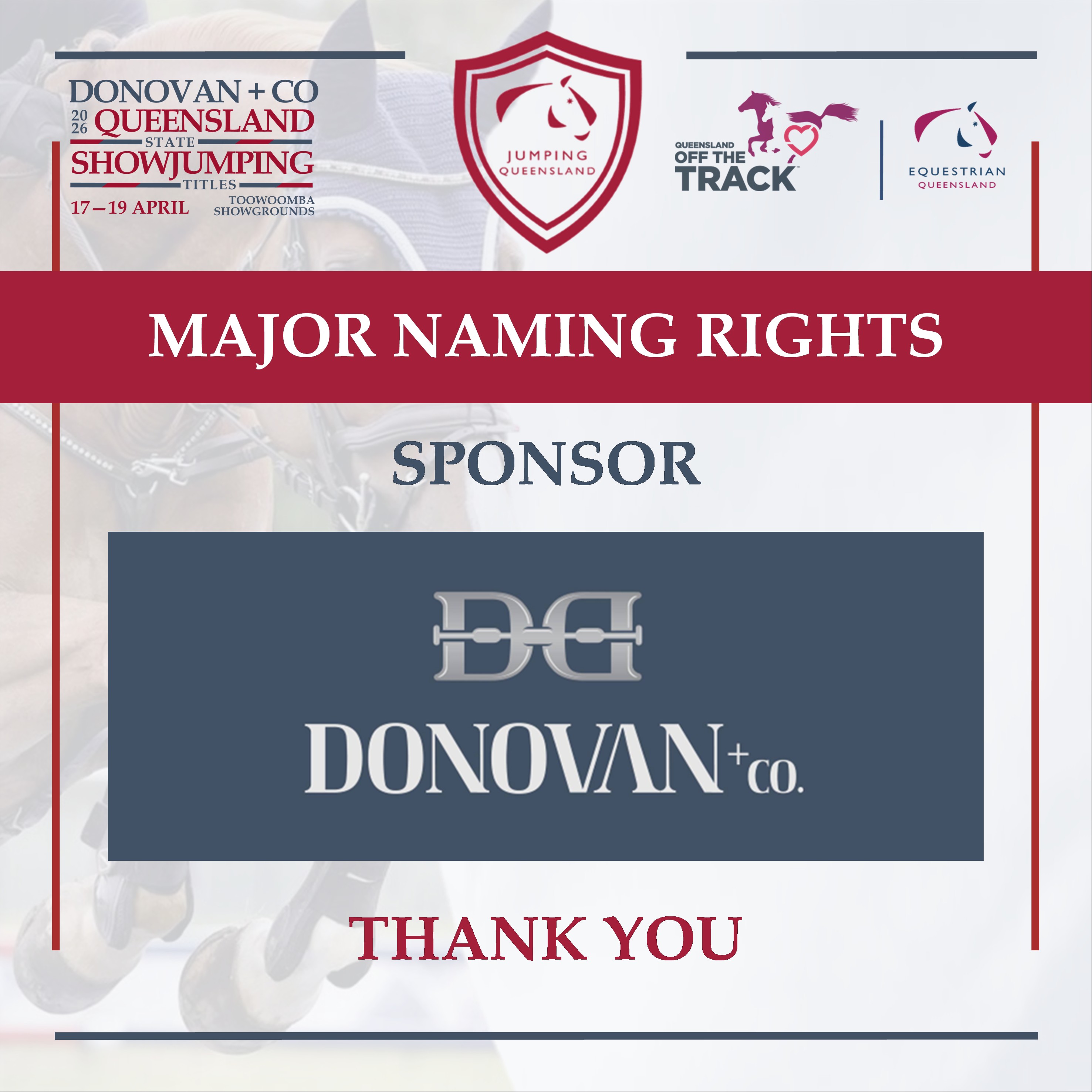 Equestrian sport relies heavily on the support of valued partners, and the success of the 2026 Championships would not have been possible without the generous contribution of our sponsors. We extend our sincere appreciation to Donovan & Co as naming rights sponsor, along with all class and event sponsors, for their ongoing commitment to the sport. Their support plays a critical role in ensuring events of this scale remain viable in Queensland. They enhance competition opportunities for our athletes, supporting event delivery, and contributing to the continued growth and sustainability of showjumping across the State.