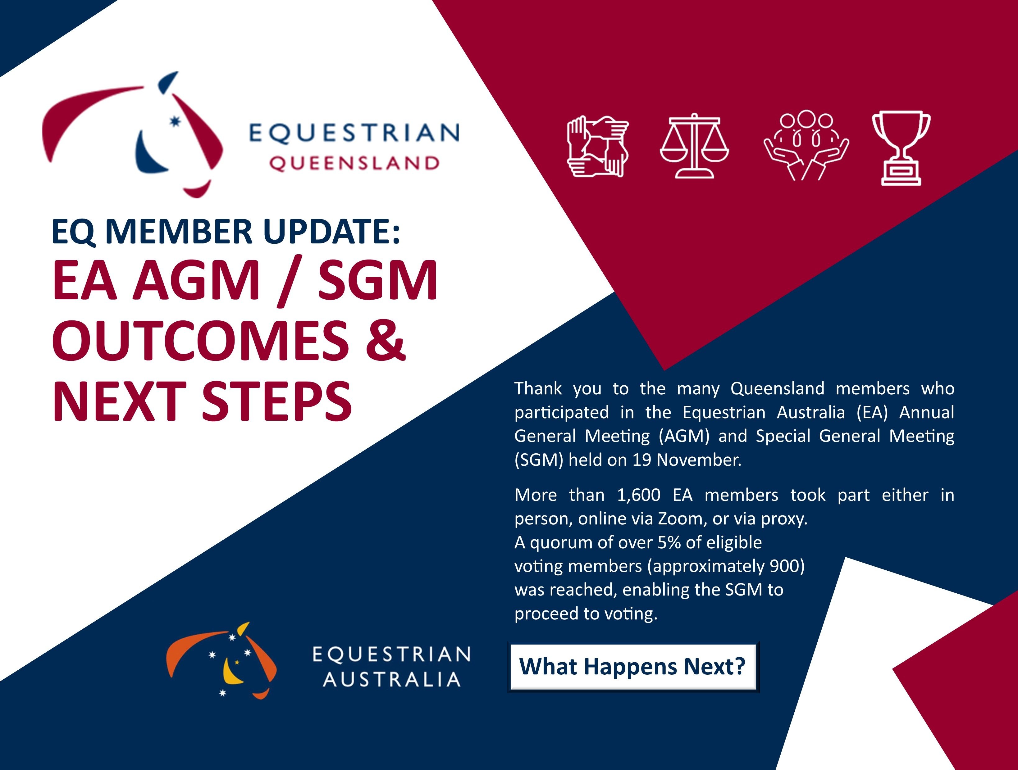 Thank you to the many Queensland members who participated in the Equestrian Australia (EA) Annual General Meeting (AGM) and Special General Meeting (SGM) held on 19 November.