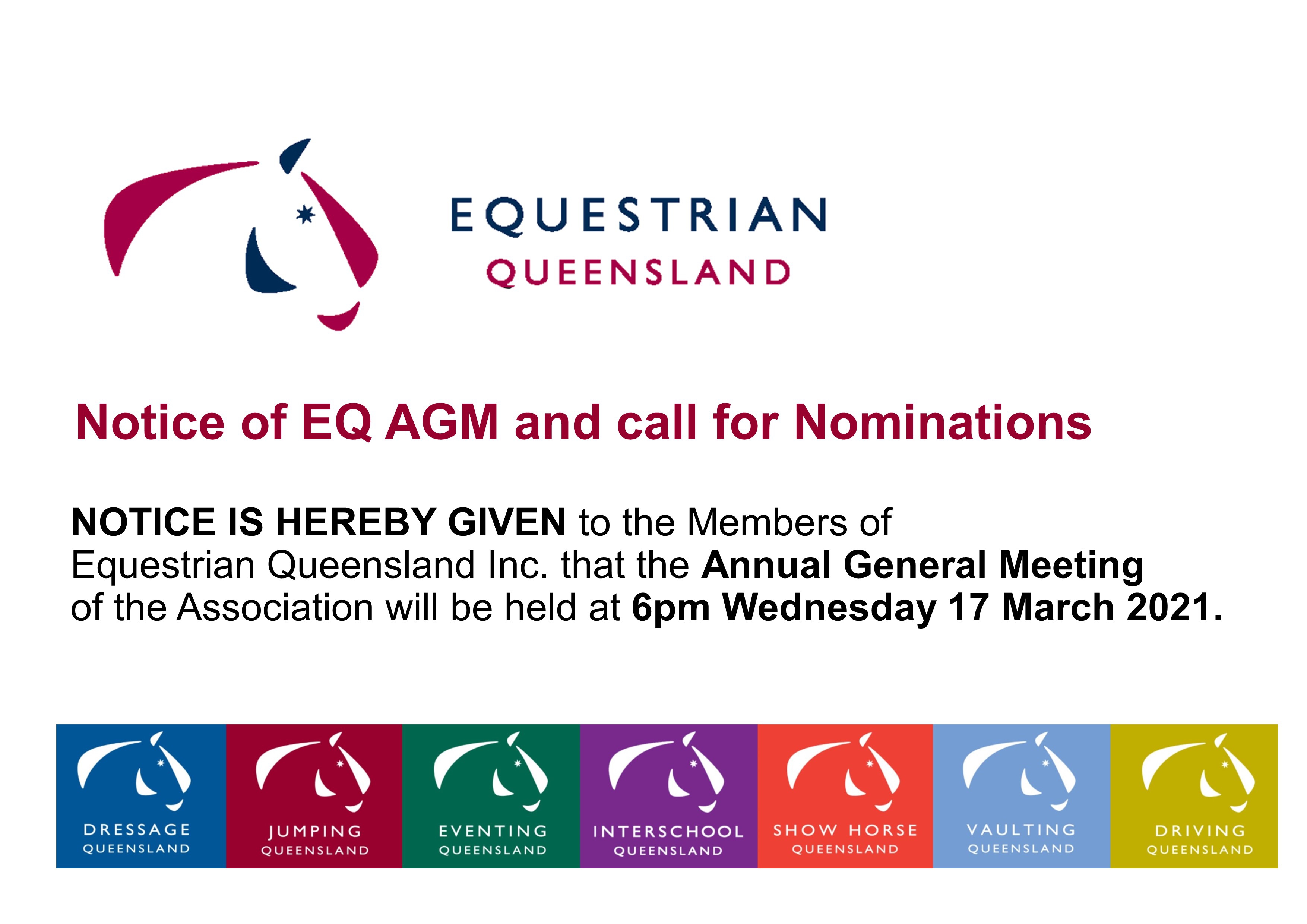 NOTICE IS HEREBY GIVEN to the Members of Equestrian Queensland Inc. that the Annual General Meeting of the Association will be held at 6.00pm Wednesday 17 March 2021.