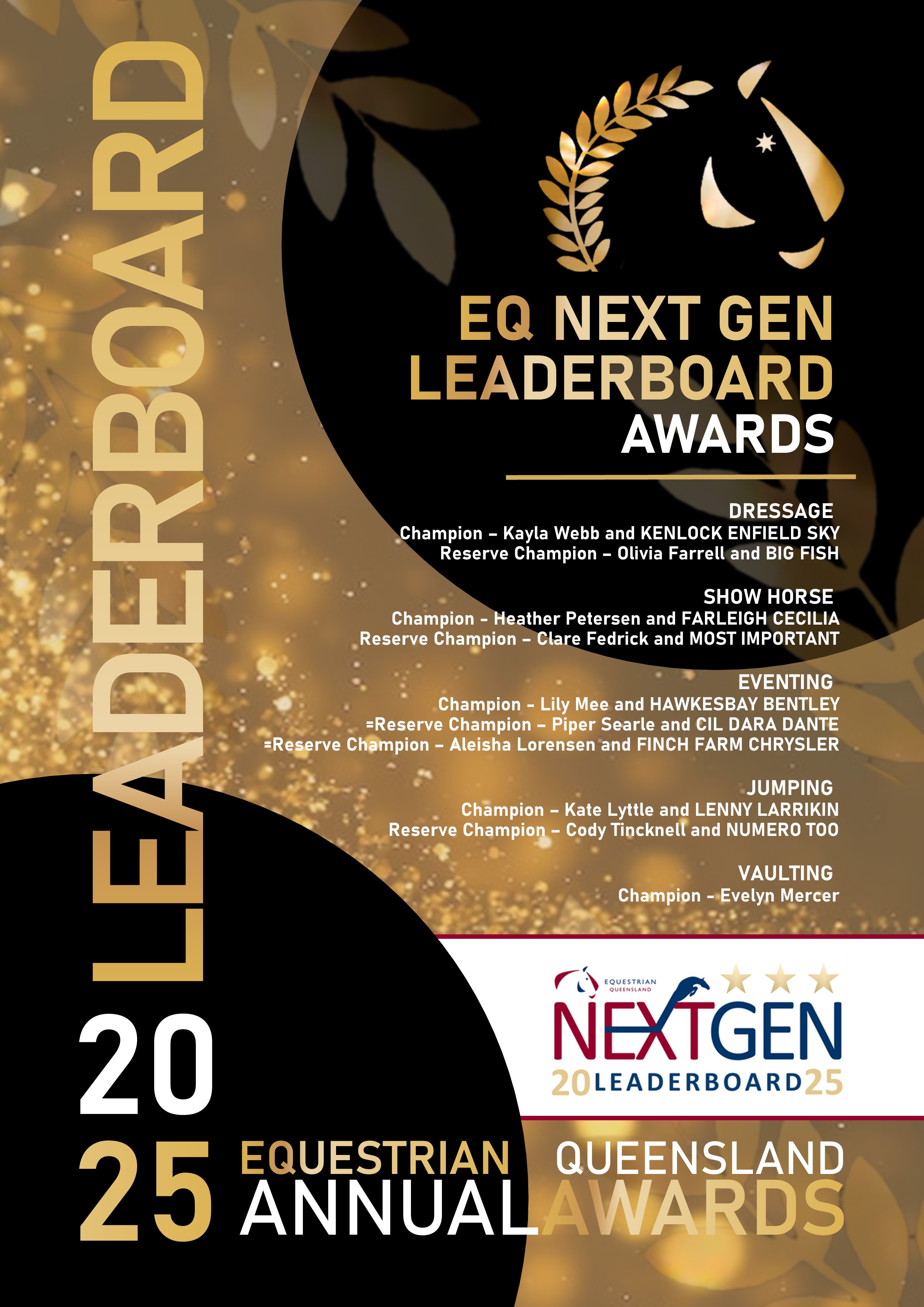 Proudly sponsored Equestrian Queensland. Award Criteria Period: November 2024 – October 2025 The Equestrian Queensland Next Gen Leaderboard is an initiative to encourage growth and recognise participation of riders between the ages of 16-25. The purpose of this leaderboard is to assist those transitioning from Interschool pathways to actively participate in official competitive events across all EQ disciplines.