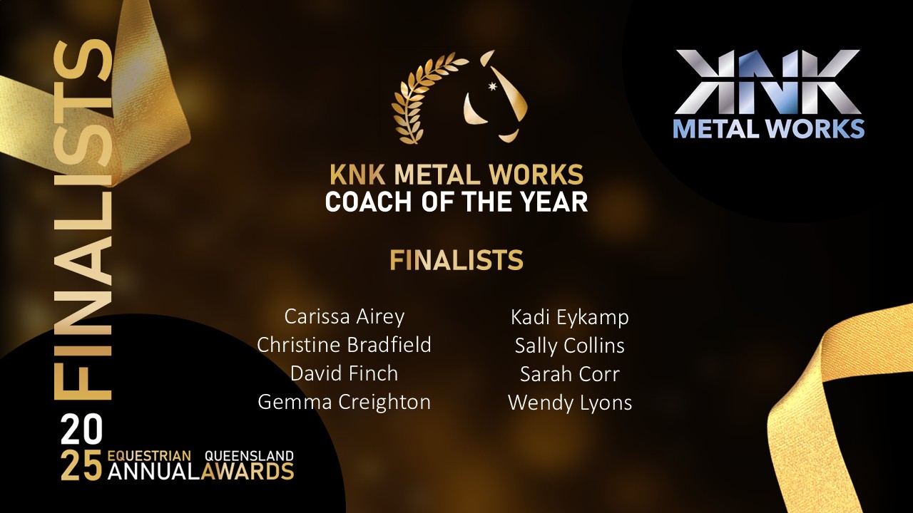 COACH OF THE YEAR Proudly sponsored by KNK Metal Works. Award Criteria Period: November 2024 – October 2025 This award recognises a Queensland EA registered coach whose dedication and skill has positively influenced both human and equine athletes during Award criteria period. The EA registered coach has made a significant contribution to the success of individuals or teams to assist them in achieving outstanding results at the highest level of senior or junior competition. The following criteria will be consdiered for judging: