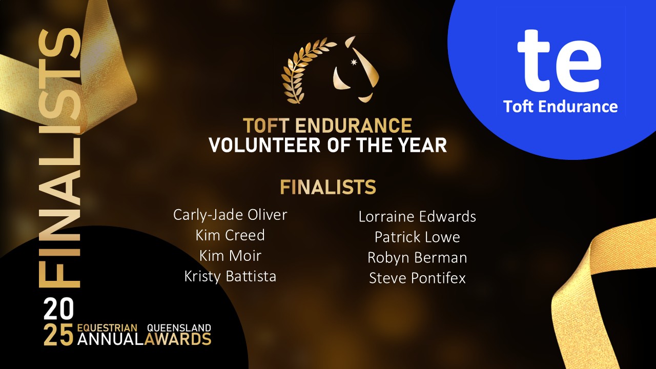 VOLUNTEER OF THE YEAR Proudly sponsored by Toft Endurance. Award Criteria Period: November 2024 – October 2025 This award recognises an individual who contributes to the running of equestrian sport and events in Queensland voluntarily. Administrators, coaches, and officials are not eligible to enter this category. Volunteers foster positive difference in the lives of others through support and encouragement, often with self-sacrifice and without personal gain. The following criteria will be considered for judging: